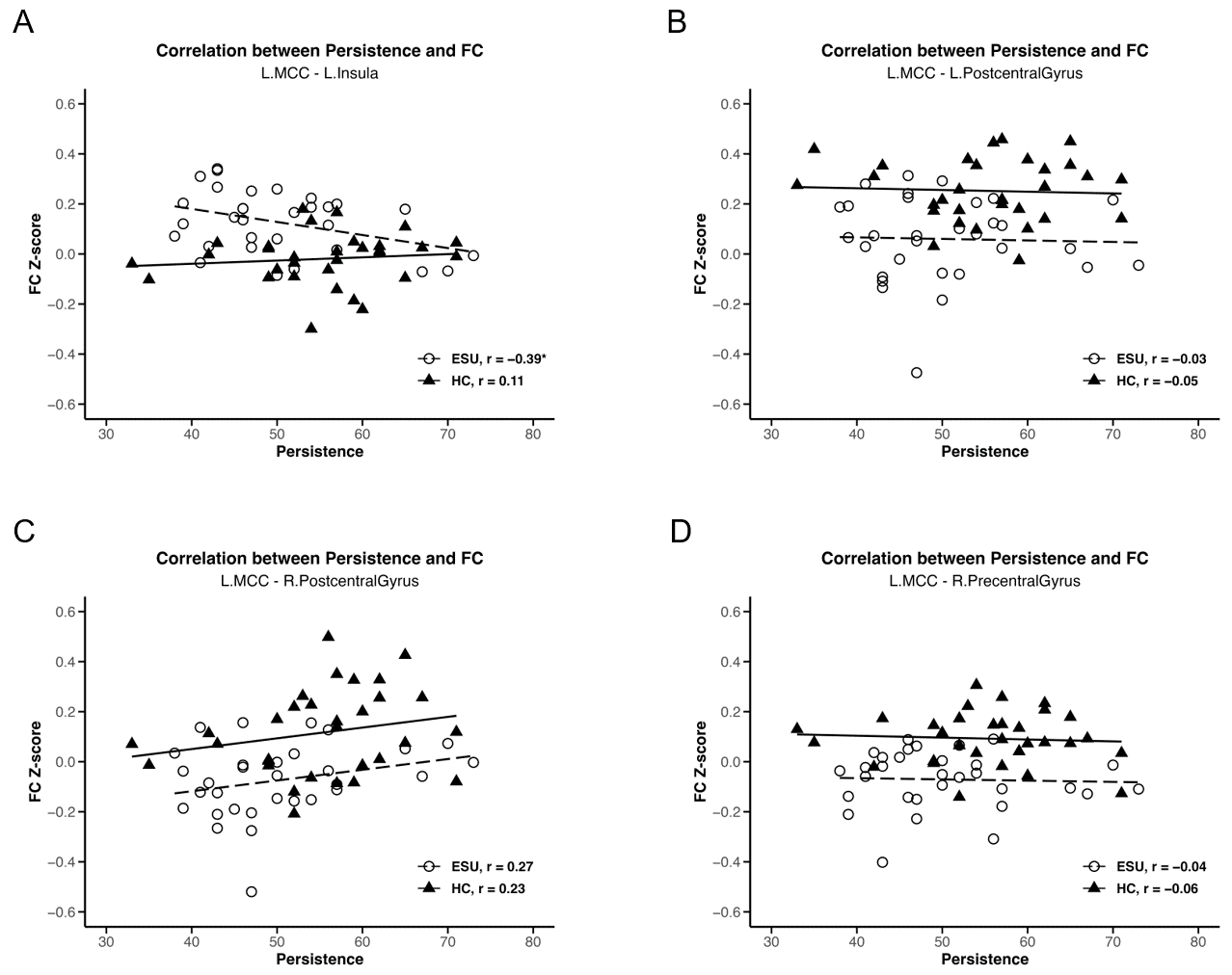 | R. Precentral Gyrus | 28 | −14 | 58 | 5.42 | 195 | ESU<HC | <0.001 | 0.37 | |