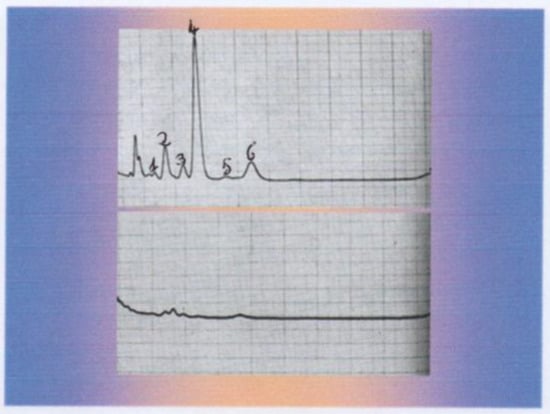 Gas-chromatographic determination of the 24 h urinary 17-Ketosteroids before (upper graph) and after dexamethasone inhibition (3 mg/day for 5 days: lower graph). 1: Pregnanediol, 2: Androsterone, 3: Etiocolanolone, 4: Dehydroepiandrosterone, 5: Pregnanetriol, 6: 11-Oxo Androsterone.