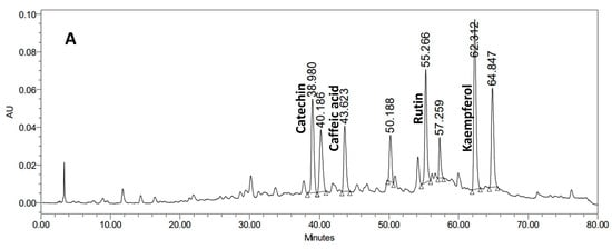Chromatographic analysis of selected phenolic compounds in the horsetail sample by HPLC allowed for the identification of four major compounds: caffeic acid, catechin, rutin, and kaempferol. Whereas the olive leaves sample revealed oleuropein as the major metabolite (Figure 1).