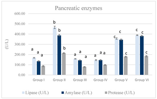 As shown in Figure 2, the MTZ group revealed a significant increase in pancreatic enzymes (lipase, amylase, and protease) in comparison with the control, Equisetum arvense, and Olea europaea groups (p < 0.05). On the contrary, the MTZ cotreatment with Equisetum arvense L. succeeded in alleviating MTZ-induced drastic effects on the pancreatic enzymes compared to the MTZ group (p < 0.05).