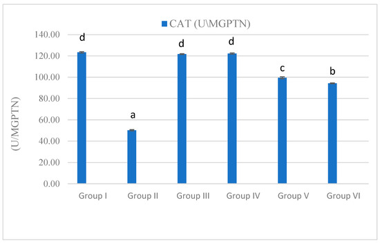 Effect on the catalase activity observed after treatment with Olea europaea leaf extract and Equisetum arvense ethanol extract at doses of 400 and 100 mg/kg, respectively, on metronidazole-induced pancreatitis in rats. Data are expressed as mean ± standard error (SE). Groups labeled with different letters indicate a statistically significant difference at p < 0.05, whereas groups sharing the same letter do not differ significantly at the same significance level.