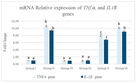 The effect of MTZ, Equisetum arvense L., and Olea europaea L. on TNFα and IL-1β gene expression in the pancreatic tissue of rats. Data are expressed as mean ± standard error (SE). Groups labeled with different letters indicate a statistically significant difference at p < 0.05, whereas groups sharing the same letter do not differ significantly at the same significance level.