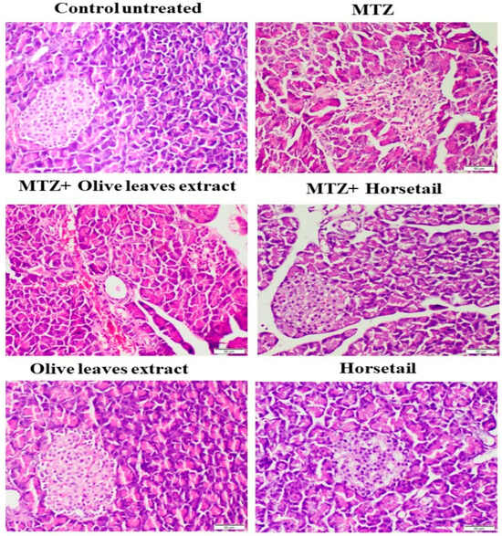 Untreated rats in the control group showed a normal histological structure for both the endocrine and exocrine glands of the pancreatic tissue. The histological sections of the MTZ-treated rats (control + ve) (Figure 8) revealed a significant decrease in the size of islet cells, as well as a distortion of their shape. Compared to normal groups, they revealed abnormal pancreatic architecture as well as degeneration and atrophy of pancreatic lobes with widening of sinusoidal spaces, mononuclear cell infiltration around inter-lobular ducts in some pancreatic regions, and dilatation of blood vessels. Additionally, histological sections of the MTZ-treated groups revealed that the vacuolation of cell populations could reach complete absence. The administration of the horsetail treatment to the MTZ-treated rats (MTZ + Horsetail) revealed significant regeneration and restoration of the islet size with mild vacuolations in pancreatic acinar cells (Figure 7). The MTZ mixed with olive treatment group (MTZ + Olive) showed a severe distortion of both endocrine and exocrine regions of the pancreatic tissues, like those in the histological pictures of the MTZ group. Both the Olive and Horsetail groups revealed normal histological pancreatic architectures.