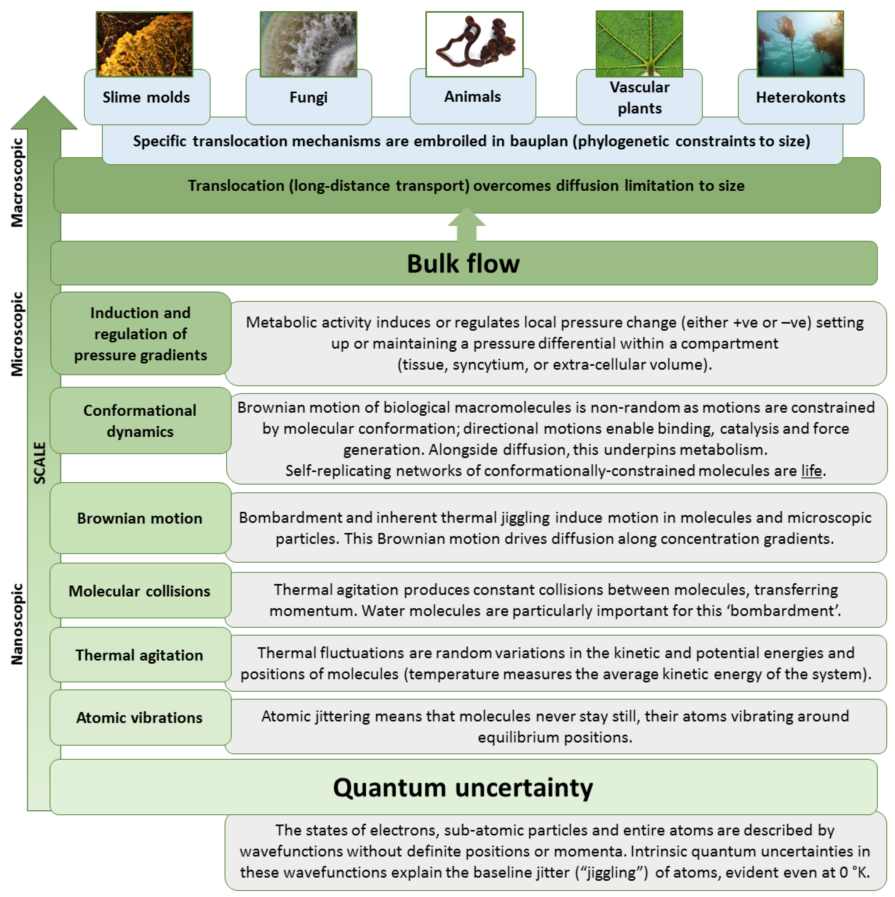 The view that emerges here is that living systems scale up by superimposing dedicated transport systems upon an underlying ‘Brownian’ system of molecular motion: from purely Brownian/diffusion to motor-driven transport on the cytoskeleton, cytoplasmic streaming, long-distance advection (sometimes including peristaltic mechanisms), up to organ- or organism-level bulk-flow systems. Vascular systems in multicellular organisms fundamentally use sub-cellular, thermodynamic (and ultimately quantum-mechanic) processes to either induce or regulate classical pressure gradients, with macroscopic classical processes ultimately emerging from quantum mechanical forces. Thus, a key evolutionary stage beyond simple multicellularity was the emergence of bulk-flow transport networks that extended the influence of Brownian and active transport processes into the macroscopic domain, overcoming diffusion limitations and thereby enabling large size and integrated physiology.