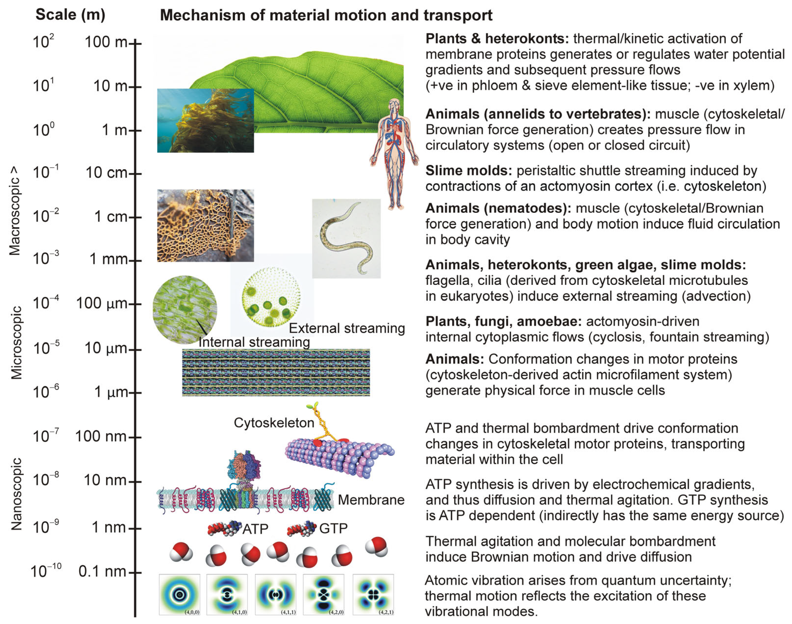 Living systems are self-governing networks of components that work to create structure; macromolecules changing conformation dependably, driven by thermodynamic gradients to induce directional processes and work that consolidates matter [1,2,3,4]. A fundamental requirement for the operation of these networks is motion. This includes the characteristic uniplanar motions (ratcheting or spinning [4,5,6,7]) of the single macromolecules and multi-subunit complexes, and also the fluidity of membranes and the internal transport of substrates and products to and from different regions within the organism. Constraints to the transport of material within organisms determine the capacity to scale in size and complexity [8,9] and are a key issue that different taxonomic groups have evidently overcome in contrasting ways during the evolutionary history of life on Earth.