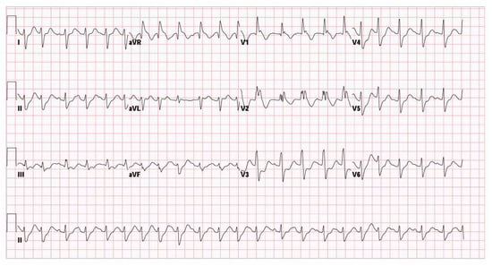 On arrival at the emergency department, her vital signs showed hypotension (blood pressure 85/50 mmHg) and tachycardia (heart rate 110 bpm). Neurologically, she was comatose (GCS: E1VEM1) with bilaterally dilated, fixed pupils (5 mm). Laboratory evaluation revealed severe metabolic acidosis (pH 6.648, bicarbonate 6.4 mmol/L, lactate 20.0 mmol/L), hyperglycemia (glucose 247 mg/dL), and leukocytosis (white blood cell count 22,000/μL) (Table 1). Sodium bicarbonate (40 mL IV, 70 mg/mL) was given to correct the severe metabolic acidosis noted shortly after ROSC. Electrocardiography (ECG) showed a new right bundle branch block (QRS interval 132 ms) and a prolonged QT interval (QTc 510 ms) (Figure 1). A urine toxicology screen was negative for most recreational drugs, except for benzodiazepines, consistent with her prescribed medications. These findings collectively indicated profound physiological stress and suggested that both severe hypoxia and toxicologic factors contributed to her critical state. Following initial resuscitation and stabilization, the patient was admitted to the pediatric intensive care unit (PICU) on the same day.