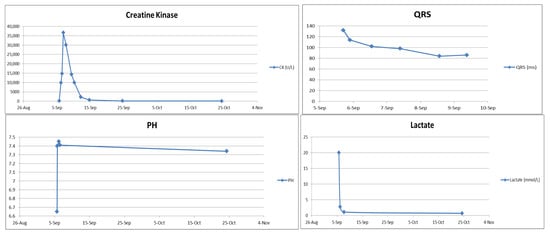 Laboratory trend (CK, QRS, pH, lactate).
