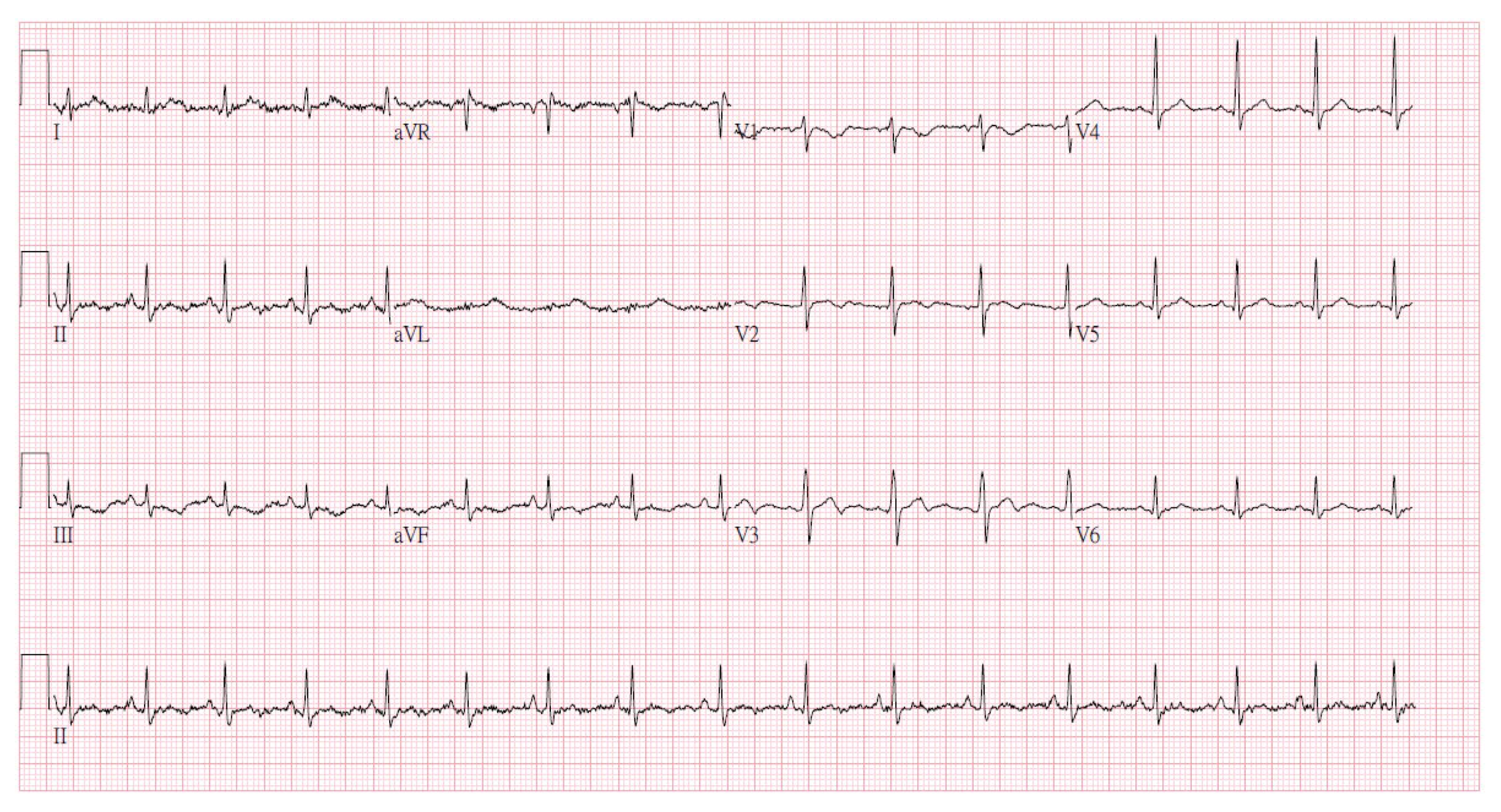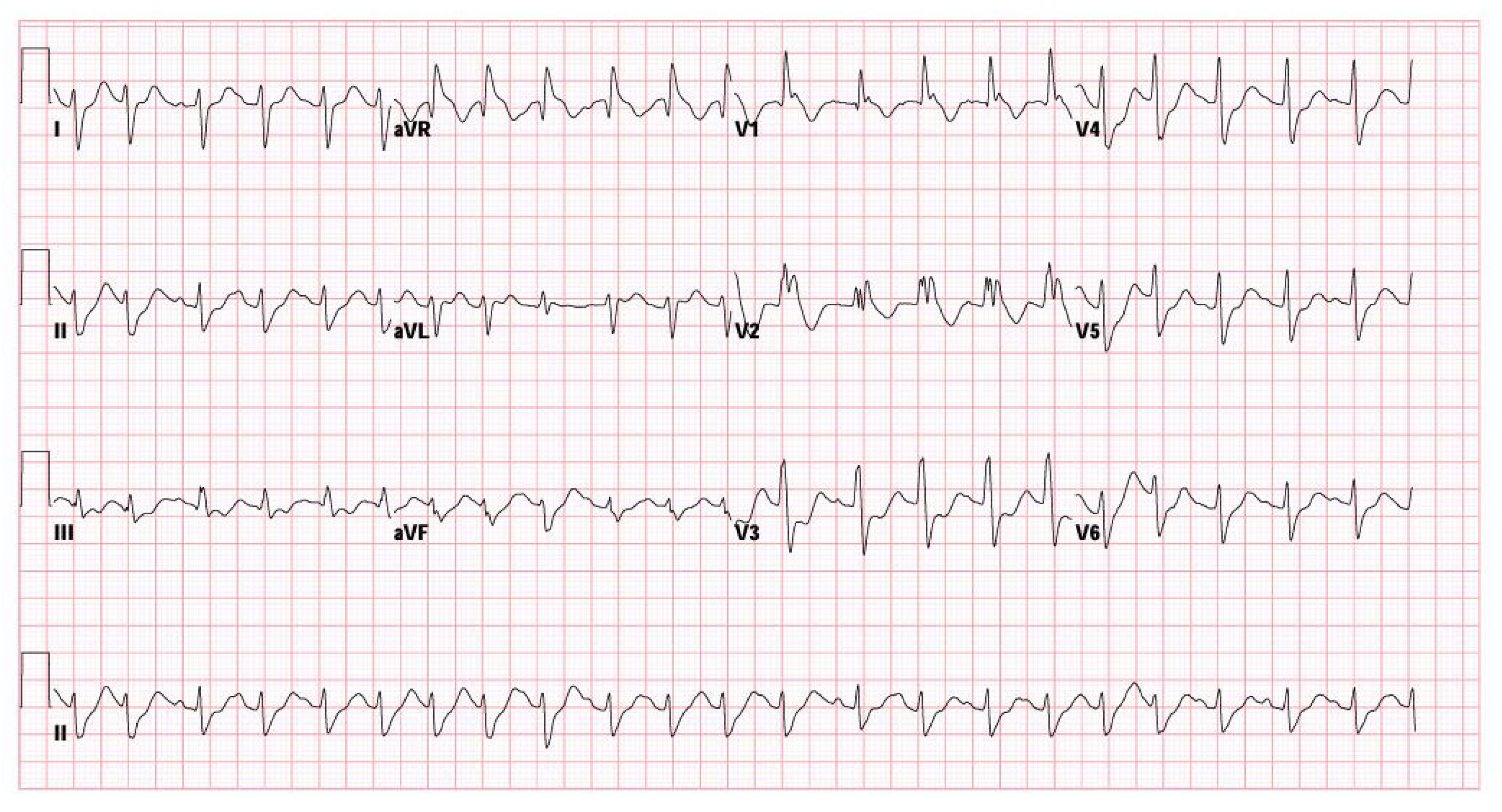 Table 1). Sodium bicarbonate (40 mL IV, 70 mg/mL) was given to correct the severe metabolic acidosis noted shortly after ROSC. Electrocardiography (ECG) showed a new right bundle branch block (QRS interval 132 ms) and a prolonged QT interval (QTc 510 ms) (
