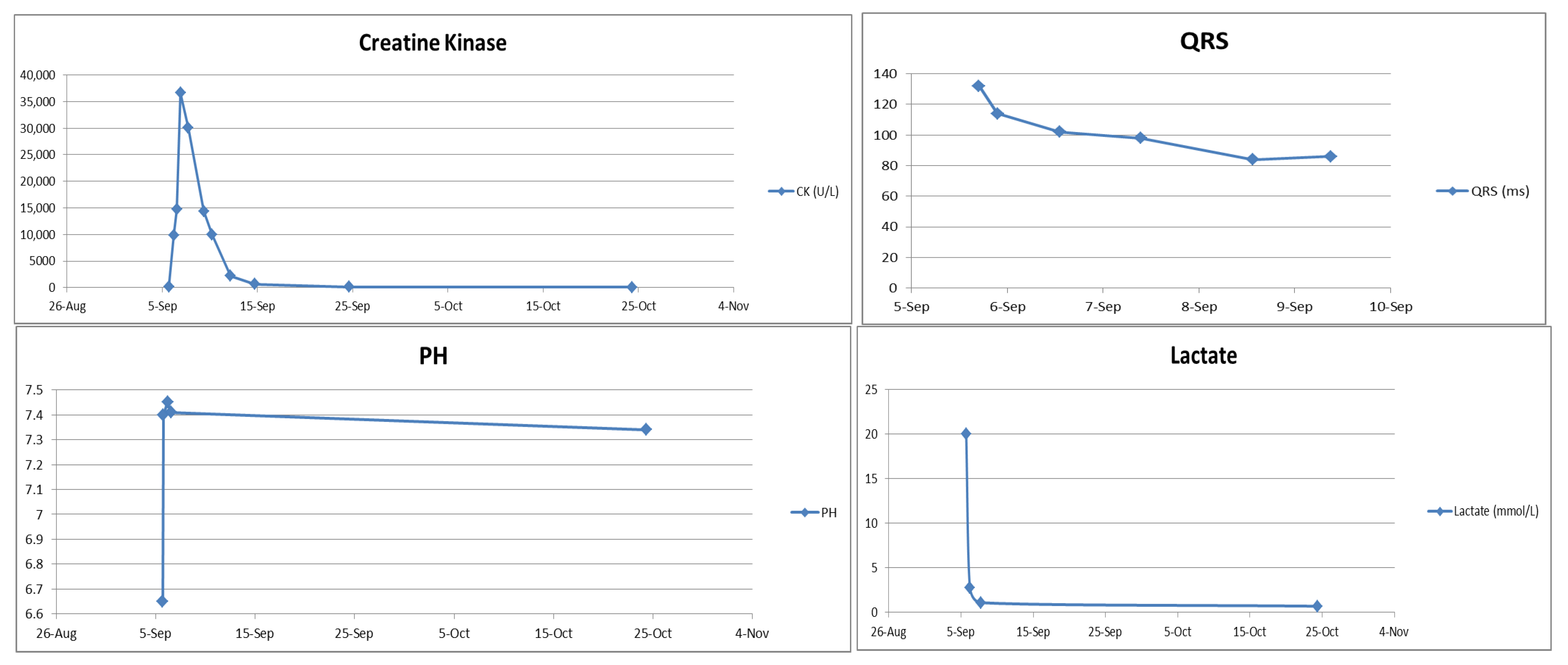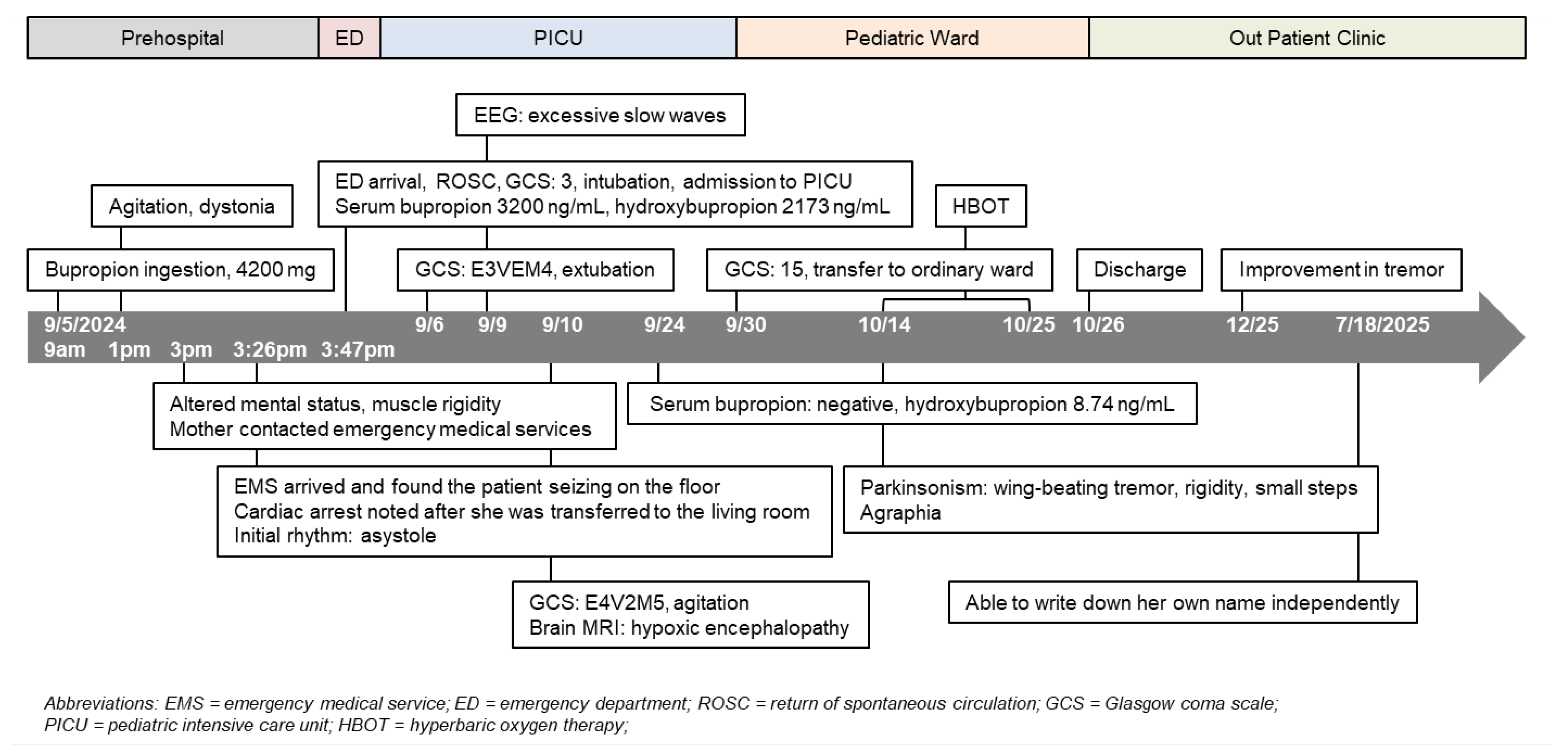 Figure 3). Regarding medical management, intravenous levetiracetam 1000 mg every 12 h was initiated for seizure control following PICU admission. Adequate intravenous fluid hydration was provided for the treatment of rhabdomyolysis. As the patient became more responsive, significant agitation emerged; therefore, oral quetiapine 25 mg at bedtime and lorazepam 0.5 mg every 6 h were prescribed after psychiatric consultation. She was also diagnosed with hypoxic encephalopathy, later confirmed by brain MRI, and subsequently manifested Parkinsonism (including bradykinesia, rigidity, and resting tremor) and agraphia, which were identified by the attending pediatric neurologist. A lumbar puncture was also performed to exclude central nervous system infection. An awake electroencephalogram (EEG) showing excessive slow waves suggested mild-to-moderate diffuse cortical dysfunction. Cognitive assessments revealed impairments in working and short-term memory, left-sided visuospatial deficits, and calculation difficulties, consistent with hypoxic brain injury. During her stay in the pediatric ward, a comprehensive rehabilitation program—including swallowing therapy, muscle strengthening, postural control training, and endurance training—was implemented to support functional recovery. She also received hyperbaric oxygen therapy (HBOT) during her hospitalization. HBOT was initiated due to prolonged hypoxia during resuscitation and its potential neuroprotective effects in hypoxic brain injury. It was not intended as a therapeutic intervention for bupropion toxicity. Follow-up ECG on 9 September (