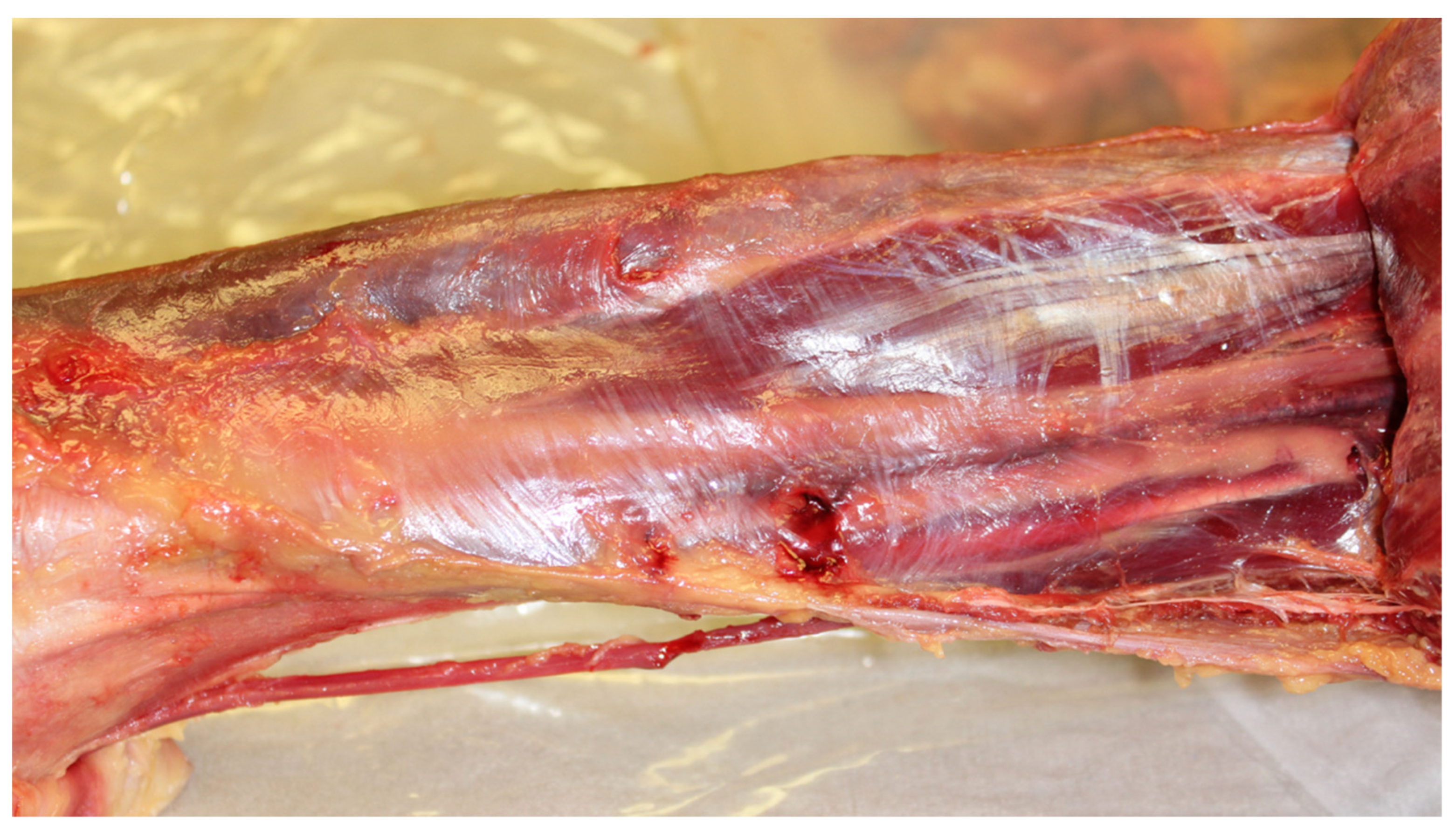 - Zhao, X.; Fede, C.; Petrelli, L.; Pirri, C.; Stocco, E.; Fan, C.; Porzionato, A.; Tiengo, C.; De Caro, R.; Masiero, S.; et al. The Impact of Sciatic Nerve Injury on Extracellular Matrix of Lower Limb Muscle and Thoracolumbar Fascia: An Observational Study. Int. J. Mol. Sci. 2024, 25, 8945. [Google Scholar] [CrossRef]