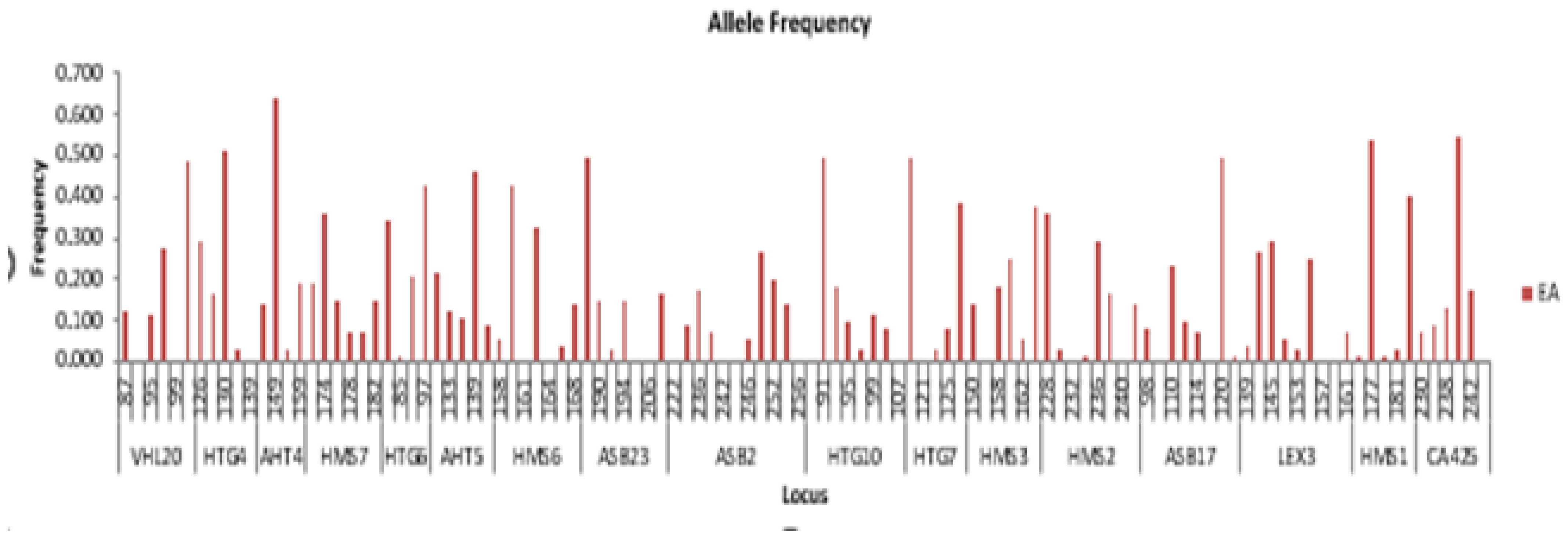 Another way to assess the genetic variability of a population is by considering the number of alleles existing for the analyzed markers. A large number of alleles indicate greater diversity. A marker is considered highly polymorphic when it has at least two alleles, and the frequency of the most common allele is equal to or less than 0.95 [