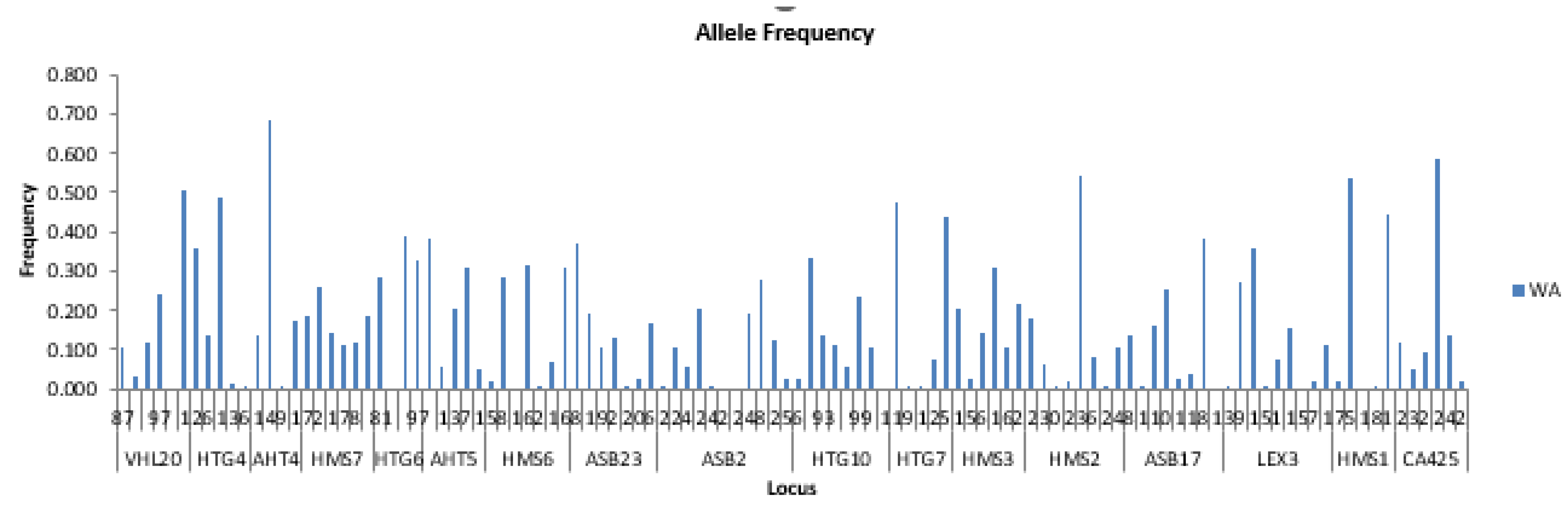 The excess of the observed number of alleles (Na) over the effective number of alleles (Ne) in both Eastern and Western Arabian horses indicates a high level of genetic diversity. Western populations display slightly greater overall diversity, with both observed and expected average allele numbers exceeding those of Eastern horses. Locus-to-locus variation highlights the complex genetic structure unique to each population, likely shaped by historical breeding programs, selective mating strategies, and the introduction of specific lineages over time [