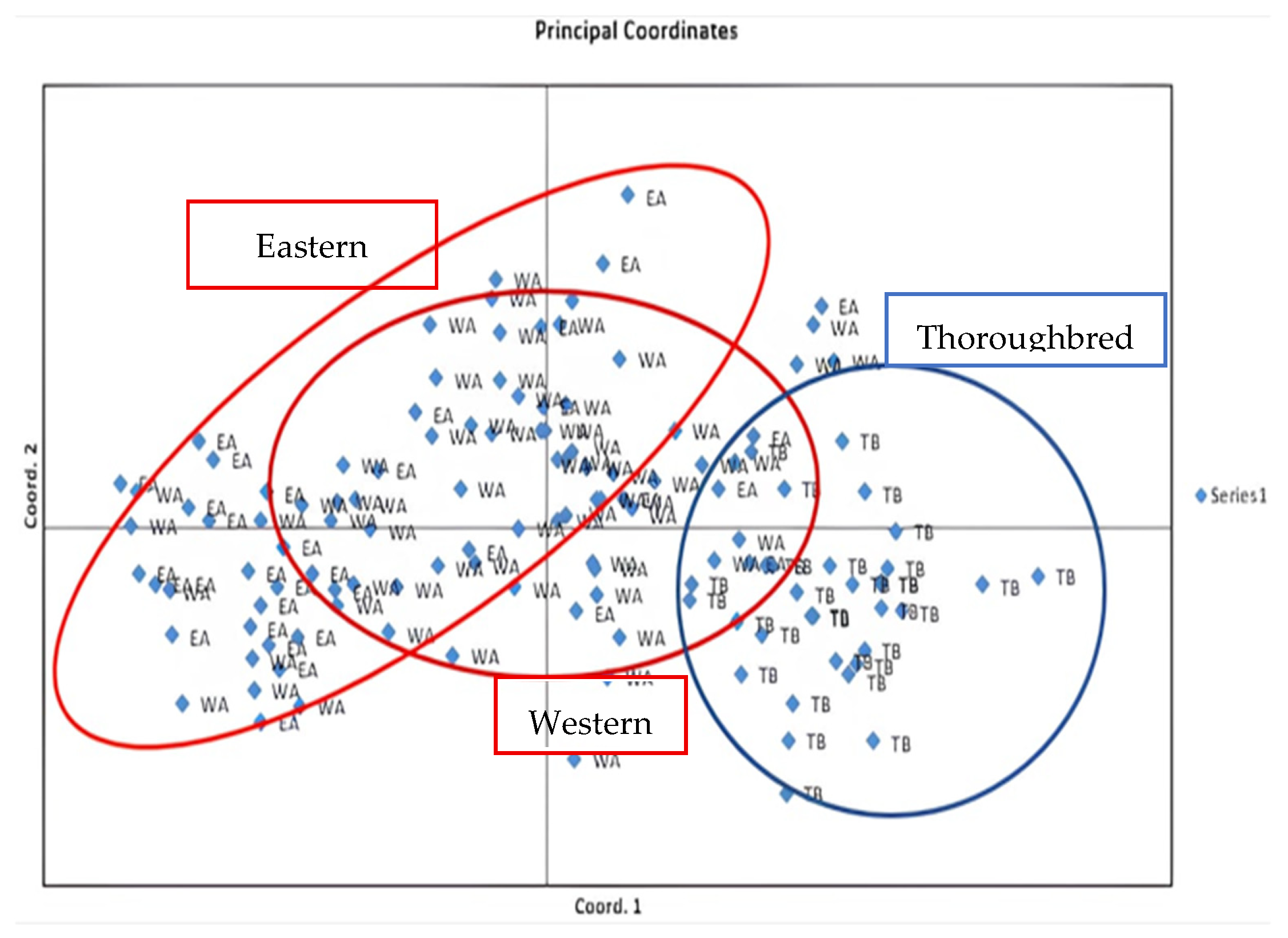 Genetic distance values further corroborate these patterns. Eastern and Western Arabian horses displayed the smallest distance (0.052), confirming their close relationship and possible historical gene flow, with 94.8% of genes being shared. In contrast, the greatest distance (0.374) was observed between Eastern Arabians and Thoroughbreds, indicating substantial divergence (62.6% similarity), consistent with the closed breeding practices of the latter. An intermediate distance (0.243) between Western Arabians and Thoroughbreds suggests some degree of shared ancestry or historical crossbreeding. Overall, the observed genetic distances are consistent with the FST results, confirming that Arabian subpopulations are more closely related to each other than to Thoroughbreds.