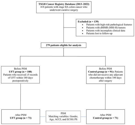 APA StyleCheng, M.-C., Lee, H.-L., Lai, S.-W., Chen, J.-H., & Chen, P.-H. (2025). Adjuvant Tegafur-Uracil Improves Survival in Low-Risk, Mismatch Repair Proficient Stage IIA Colon Cancer: A Propensity Score-Matched Analysis. Life, 15(12), 1930. https://doi.org/10.3390/life15121930