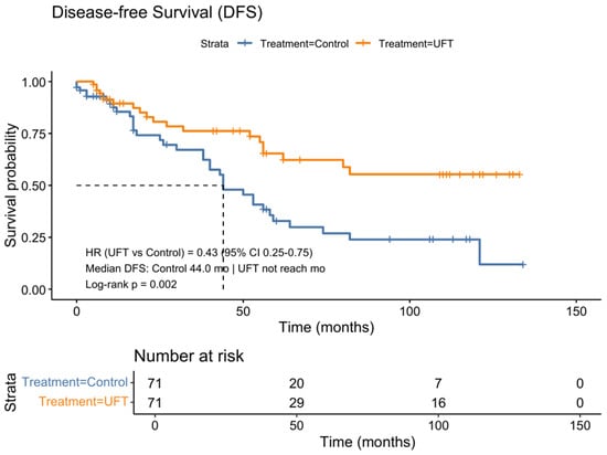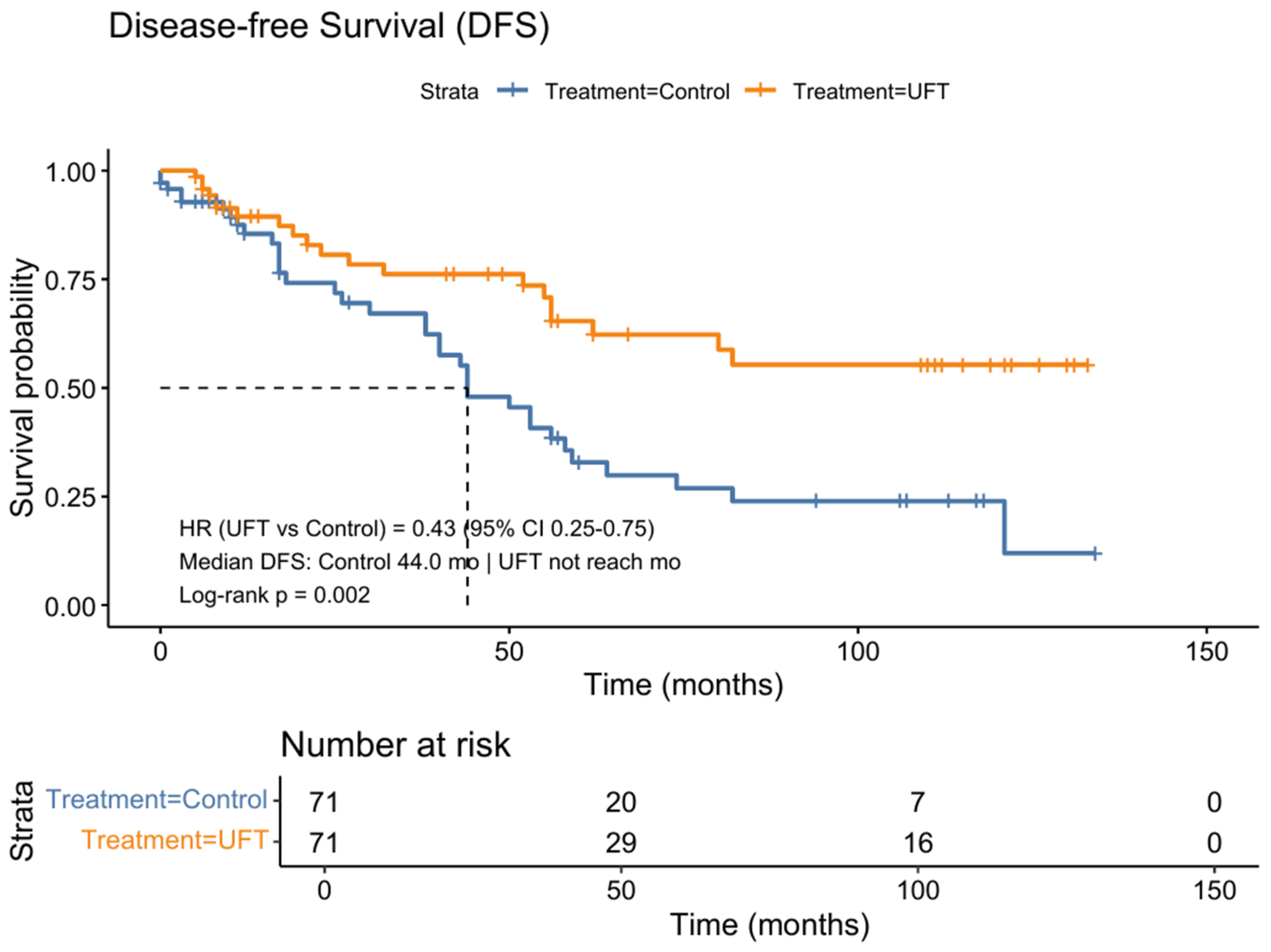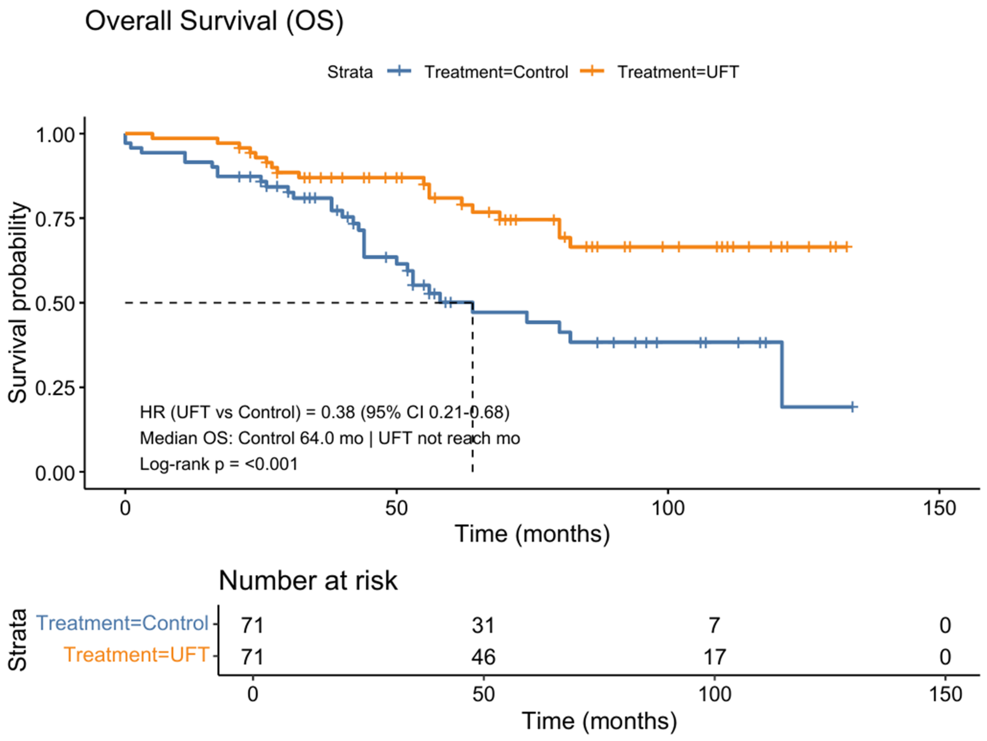 | UFT dose (mg/day) [UFT group only] | 200/300/400/600 | NA | 8 (11.3%)/15 (21.1%)/47 (66.2%)/1 (1.4%) | ||