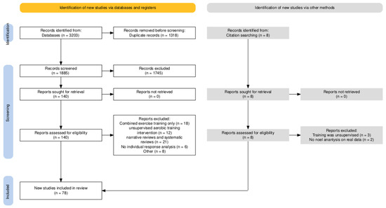 The literature search yielded 3203 records. Using NoteExpress software, 1318 duplicate records were removed. A total of 1885 articles proceeded to the title and abstract screening phase. After reviewing the abstracts, 1745 irrelevant articles were excluded. Full texts of 140 articles were downloaded. After reading the full texts, 65 were excluded (reasons for exclusion include: 18 reports of combined exercise training only, 12 reports of unsupervised aerobic training intervention, 21 narrative and systematic reviews, 6 reports with no individual response analysis, and 8 for other reasons), leaving 75 articles. Three additional articles meeting the inclusion criteria were identified through reference tracing. The systematic review ultimately included 78 articles, including 8 meta-analyses. Detailed information on the included studies is provided in Supplementary Materials Tables S3 and S6. Figure 1 illustrates the literature screening process.