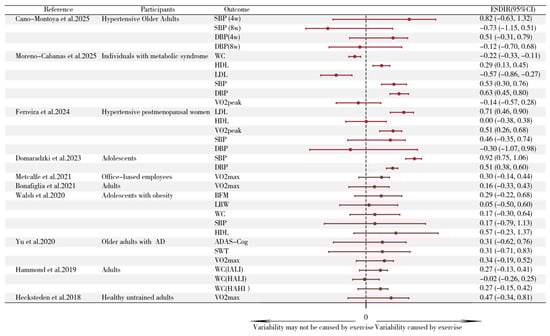 We synthesized results from 78 studies. The majority of included studies failed to consider random variation and within-subject variation when evaluating inter-individual differences. This suggests that the majority of existing studies lack sufficient evidence to interpret the observed variability in aerobic training adaptations as true individual differences in intervention effects. To support this inference, we calculated 31 ESDIR values from selected studies, with most studies showing ESDIR values either below zero or crossing zero (24/31) (Figure 2). Although the overall pattern was consistent, a few exceptions for specific outcomes (e.g., HDL, SBP, and DBP in Moreno-Cabanas et al. [32].) were observed. Additionally, we synthesized 11 outcome measures from 8 recent meta-analyses examining inter-individual differences in aerobic training adaptations. Across all measures, the 95% confidence intervals for SDIR2 effect sizes crossed zero. To disentangle random variation and within-subject variation from the observed inter-individual differences, a meta-analysis was conducted on the ΔSD of SBP for both exercise and control groups in selected studies listed in Figure 2 (see Formula (1)). After disentangling random variation and within-subject variation from the observed inter-individual differences, the synthesized results from the included studies provided no compelling evidence for the existence of inter-individual differences in exercise intervention effects.