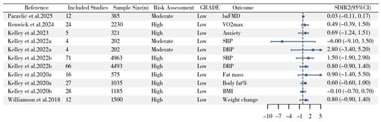We calculated ESDIR values and their 95% confidence intervals (CIs) across 10 studies, comprising 31 groups of data as presented in Figure 2. Detailed information regarding participant characteristics and aerobic intervention protocols for each study is provided in Supplementary Materials Table S5. To minimize heterogeneity and more accurately represent the original data, we did not pool the data. Given the substantial heterogeneity in participant characteristics and intervention protocols across studies, we did not calculate an overall pooled effect size. However, the studies presented mixed evidence, with the majority of ESDIR 95% CIs either crossing zero or lying below zero. The ESDIR estimates from Moreno-Cabanas et al. (2025), (n = 264) [32] revealed that the 95% CIs for HDL, SBP, and DBP lay above zero. The ESDIR estimates from Ferreira et al. (2024), (n = 65) [36] demonstrated that the 95% CIs for LDL and VO2peak lay above zero. The ESDIR estimates from Domaradzki et al. (2023), (n = 141) [29] showed that the 95% CIs for SBP and DBP lay above zero. For all remaining studies (Cano-Montoya et al., 2025 [31], n = 26; Metcalfe and Vollaard, 2021 [33], n = 25; Bonafiglia et al., 2021, n = 29 [28]; Walsh et al., 2020 [24], n = 91; Yu et al., 2020 [25], n = 26; Hammond et al., 2019, n = 97 [23]; Hecksteden et al., 2018 [18], n = 36), the 95% CIs for ESDIR estimates either crossed zero or lay below zero. Additionally, the forest plot in Figure 3 displays 11 SDIR2 estimates and their 95% confidence intervals (CIs) from meta-analyses of different indicators of inter-individual variability in adaptations to aerobic training. These 11 datasets were derived from eight meta-analyses[11,12,37,38,39,40,41,42]. The 95% CIs for SDIR2 across all outcome measures include zero. Detailed information for each meta-analysis is provided in Supplementary Materials Table S6. Of the 31 ESDIR estimates from primary studies, 24 (77%) had 95% CIs that crossed or were below zero (Figure 2). Similarly, all 11 SDIR2 estimates from previous meta-analyses had 95% CIs that included zero (Figure 3), indicating a consistent lack of evidence for true inter-individual differences across the literature. (When is negative, based on statisticians’ recommendations, the sign should be changed first, and the result should be presented as a negative standard deviation, interpreted as the variability in the control group being greater than that in the experimental group.)