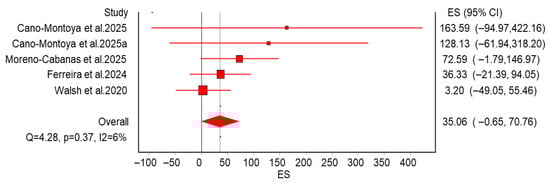 We calculated the SDIR2 for SBP in each study included in Figure 4 and conducted a meta-analysis based on this. Figure 5 presents the meta-analysis results: the pooled effect size was 35.06 (95% CI −0.65 to 70.76), (Q = 4.28, I2 = 6%). The results of the meta-analysis indicate a Q value of 4.28, suggesting that there is no significant heterogeneity among the studies included. The I2 value is 6%, indicating that only 6% of the total variability can be attributed to between-study differences, which reflects a high level of consistency among the studies. Since the 95% CI spans zero, current evidence is insufficient to indicate additional between-individual variability in SBP response to aerobic exercise interventions. Detailed information on the included studies is provided in Supplementary Table S5.