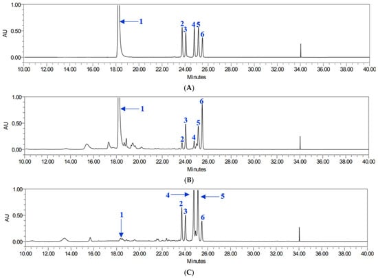 HPLC chromatogram of compounds 1–6 (A), YML (B), and YNR (C).