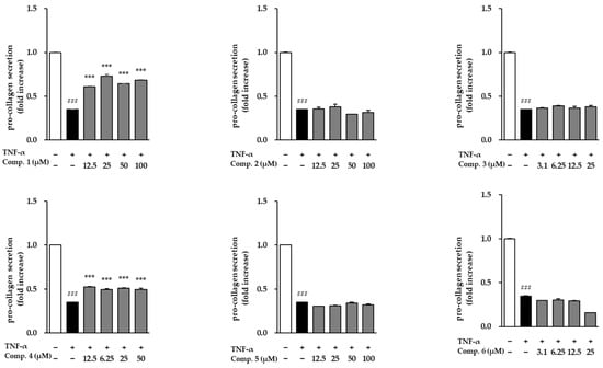 The modulation of COL1A1 secretion by compounds 1–6 in TNF-α-challenged NHDFs. COL1A1 levels were determined by ELISA and reported as fold difference relative to vehicle-treated groups (mean ± SEM; n = 2). ### p < 0.001 vs. control; *** p < 0.001 vs. TNF-α.