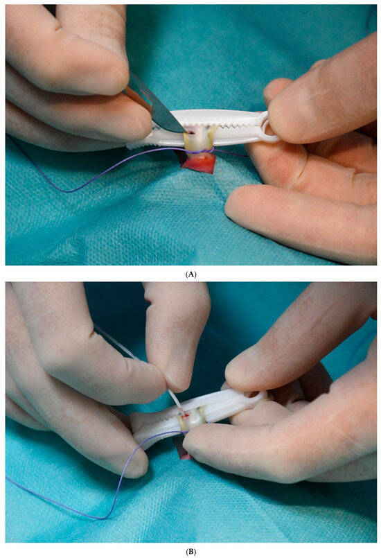 The initial stage of umbilical catheter insertion is comparable to the conventional method, involving thorough cleansing and disinfection of the umbilical cord and the umbilical clamp, followed by sterile draping of the peri-umbilical region and the application of umbilical tape. Octenidine dihydrochloride was used for disinfection. An umbilical cord clamp (Intergos, Bielsko-Biała, Poland) was employed. In contrast to the standard method, the umbilical cord stump with the umbilical cord clamp is not cut off. This constitutes the principal modification, in addition to the side-entry technique. The umbilical cord is then carefully examined, and the sites where the umbilical vessels are visible in the longitudinal axis are identified. Once the umbilical vein has been located, a transverse incision is made and the anterior wall of this vessel is gently incised just below the umbilical cord clamp (“side-entry”; Figure 1A), which is positioned approximately 1 cm from the ventral attachment of the umbilical cord. A catheter is subsequently inserted into the vessel lumen (Figure 1B).