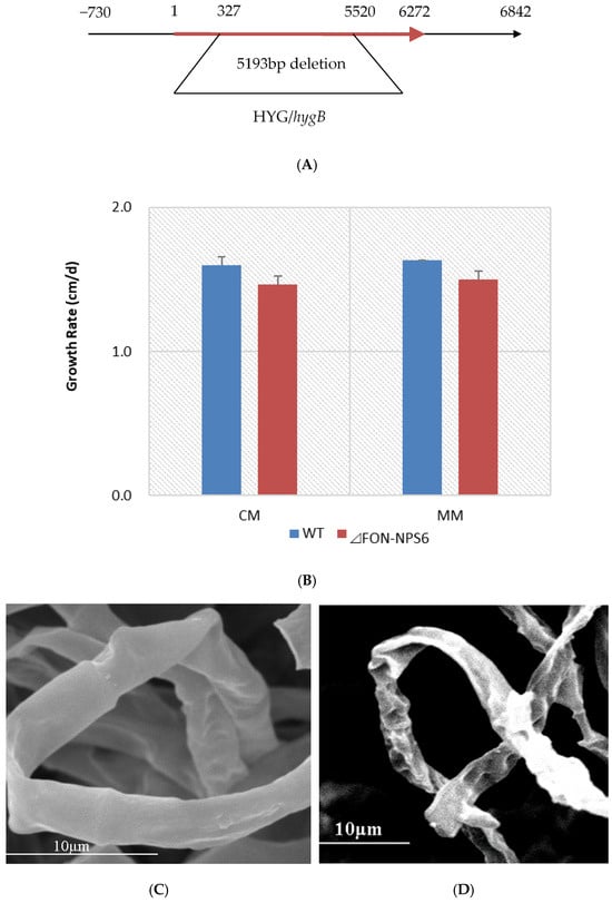 Deletion of FoNPS6 affected multiple growth-related characteristics. (A) FoNPS6 was deleted with split marker constructs. Binding sites for primers used to confirm mutants are noted with asterisk. (B) Growth rate of average colony diameters of WT and ΔFON-NPS6 strains grown on MM or CM. Error bars indicate 95% confidence intervals. Statistically significant difference (p < 0.05) in growth was observed. (C,D) Scanning electron microscopy analysis of morphology of WT (C) and ΔFON-NPS6 (D) strains grown on MM. Surface of WT mycelium was smoother than that of ΔFON-NPS6 mycelium.