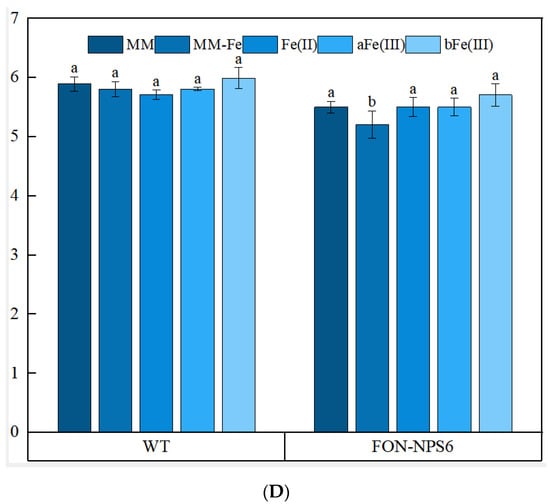 The deletion of FoNPS6 leads to hypersensitivity to superoxide and H2O2 and to iron depletion. Different lowercase letters above the bars indicate significant differences between treatments (p ≤ 0.05). (A) The hypersensitivity of the ΔFON-NPS6 strain to 20 mM of H2O2. Three-day-old cultures of the WT (top row) and ΔFON-NPS6 (bottom row) strains. The growth of the ΔFON-NPS6 strain was completely inhibited on the MM, and the WT grew under the same conditions. (B) The hypersensitivity of the ΔFON-NPS6 strain to 40 mM of KO2. Three-day-old cultures of the WT (top row) and ΔFON-NPS6 (bottom row) strains. The growth of the ΔFON-NPS6 strain was completely inhibited on the MM, and the WT grew under the same conditions. (C) The hypersensitivity of the ΔFON-NPS6 strain to 400 μM of 2DP (iron chelator). Three-day-old cultures of the WT (top row) and ΔFON-NPS6 (bottom row) strains. The growth of the ΔFON-NPS6 strain was completely inhibited on the MM, and the WT grew under the same conditions. (D) The hypersensitivity of the ΔFON-NPS6 strain to iron deficiency (MM without FeSO4). The error bars indicate 95% confidence intervals. A statistically significant difference in size (p < 0.05) was observed. No differences in sensitivity to iron addition (1 mM of ferrous ammonium sulfate (Fe(Ⅱ)) or ammonium ferric sulfate (aFe(Ⅲ)) or ferric citrate (bFe(Ⅲ)) were detected between the WT and ΔFON-NPS6 strains. Different letters on the columns layer represent significant differences (p < 0.05).