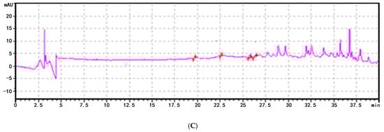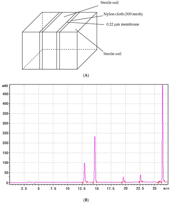 Allelochemicals were extracted following the method outlined by Martens [21]. The extracts were analyzed with an Agilent 1200 semipreparative HPLC system (Santa Clara, CA, USA). Phenolic acids were separated using a synthetic solvent gradient elution method under certain assay conditions. The gradient program was designed as follows: 0–27 min, 100–90% solvent A, 0–10% solvent B; 27–42 min, 90–85% solvent A, 10–15% solvent B; 42–50 min, 85–70% solvent A, 15–30% solvent B; 50–60 min, 70–50% solvent A, 30–50% solvent B; 60–70 min, 50–0% solvent A, 50–100% solvent B. Standards for 4-hydroxybenzoic acid, vanillic acid, ferulic acid, benzoic acid, 3-phenylpropanoic acid, and cinnamic acid were sourced from Sigma-Aldrich (Steinem, Germany), and stock solutions were created in methanol. The HPLC chromatogram for PAs was created following the previously outlined method with an injection volume of 5 μL.