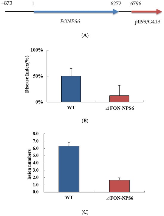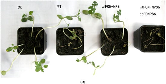 To assess the virulence of WT, ΔFON-NPS6, and complementary strains, spores were resuspended in sterile distilled water supplemented with 0.02% (v/v) Tween 20, with a final spore concentration of 1 × 107 CFU/mL. Three-week-old watermelon plants (ten per assay) were transplanted into pots with a volume of 640 cm3. The plants were placed in a mist chamber for 24 h, followed by incubation in a growth chamber with a 16 h light/8 h dark cycle at 24 °C. Virulence was assessed 5 days post-inoculation using the method outlined by Pritsch et al. [22]. Fusarium wilt symptoms in each plant were assessed using a 0–5 scale as follows: 0 means the plant remained entirely healthy; 1 means less than 10% of the leaves showed wilting; 2 means 11–20% of the leaves wilted; 3 means 21–50% of the leaves wilted; and 4 means 50–100% of the leaves were affected.