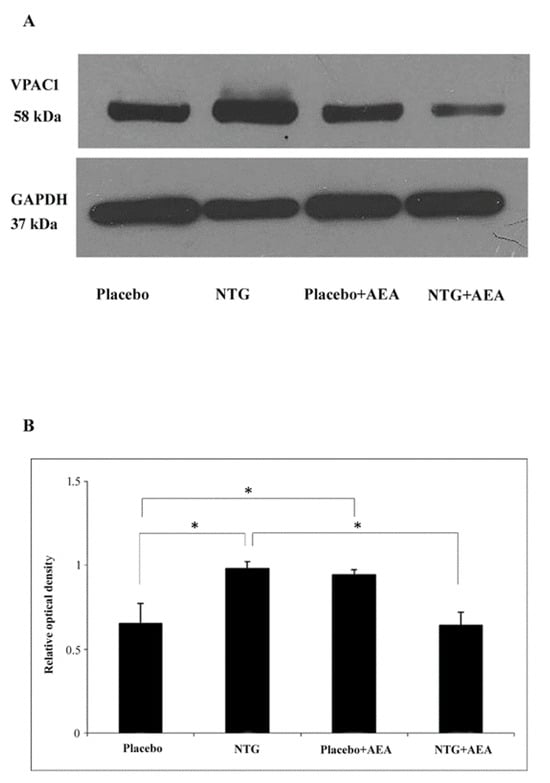 Effect of NTG and AEA on the expression of VPAC1, Western blot data. (A). Western blotting of VPAC1 and GAPDH expression in the C1-C2. (B). Quantitative data demonstrate, that the relative optical density of VPAC1 in the NTG and AEA groups is significantly higher than in the placebo group. NTG + AEA mitigated this effect. * p < 0.05.