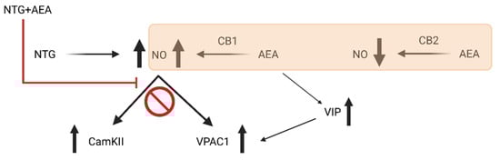 Possible mechanisms of NTG and AEA on the CamKIIα and VPAC1 expression. Both NTG and AEA can increase the expression of CamKIIα and VPAC1, probably by generating NO production. NO can initiate the phosphorylation of CamKIIα and can activate adenylate cyclase, which also triggers the production of PACAP. In addition to this, AEA also promotes the formation of NO by the CB1 receptor. On the other hand, the combined treatment might cause a huge boost in NO production, which activates a negative feedback mechanism and decreases the levels of NO in the long run. Also, it is well known that AEA can also reduce the synthesis of NO via the CB2 receptor.