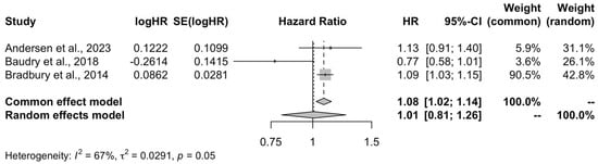 | Breast cancer | 1.13 (0.91–1.40) | 0.77 (0.58–1.01) | 1.09 (1.03–1.15) |