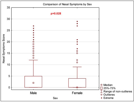 For nasal symptoms, we noted statistically significant differences regarding sex (Figure 1). The median of the nasal symptoms was significantly lower in women than in men. The observations were similar for general symptoms, but the result was not statistically significant. Moreover, for the overall scores of ROE and FROI-17, as well as self-confidence, we did not notice statistically significant differences.