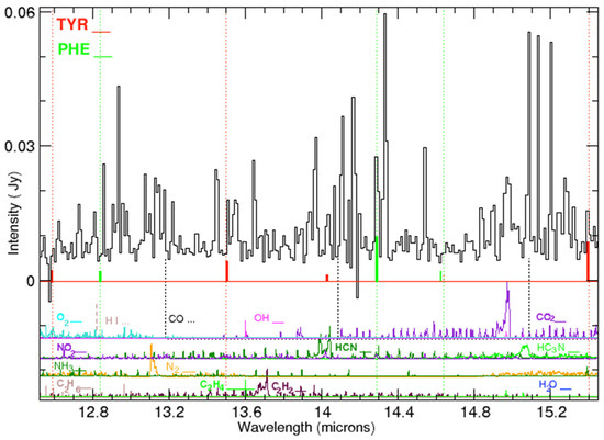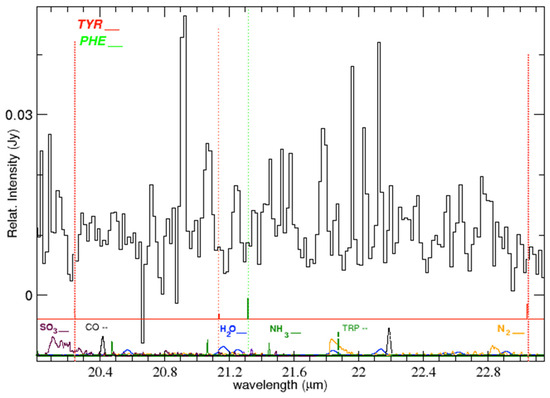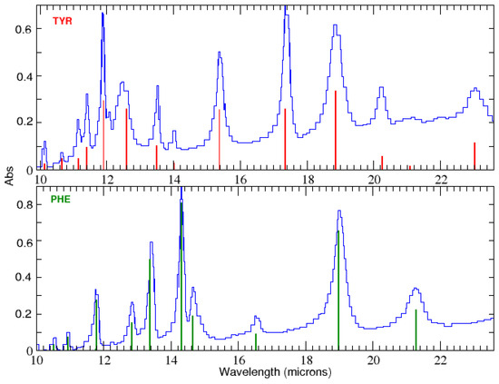 Systematic laboratory work (e.g., [18,22,23]) has led to the identification of many relatively intense amino acid bands in the mid-IR (Figure 1). Among the various proteinogenic amino acids, the aromatic amino acids tyrosine and phenylalanine display the largest number of bands reported between 10 and 36 μm. Absorbance is in relative units.