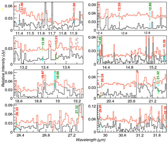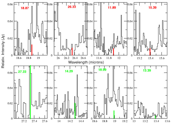 Line fluxes were derived from the combined IC 348 ISM spectrum by fitting a Gaussian profile and integrating the flux above a local continuum using the IRAF SPLOT routine. A straight line was used to fit the local continuum for a given emission line. Errors in those fluxes were estimated by propagating pixel error through the line integrals using the standard deviation of the residuals of the fit and are typically of the order of 20%. In Table 2, the uncertainties of each flux for individual entries are provided, along with indications if an emission feature coincides with lines from the molecules referenced by Iglesias-Groth and Marin-Dobrincic [24]. Upper limits were derived by measuring the flux of a Gaussian with a height three times the local RMS of the continuum, and with a FWHM equal to the instrumental resolution (approx. 0.02 μm). In those cases, where the RMS of the continuum was difficult to establish because of neighbor contaminant lines, the RMS was taken as that of the nearest region with a “clean continuum”, selected among the following spectral ranges: 10.10–10.15 μm, 11.75–11.80 μm, 14.35–14.5 μm, 14.60–14.7 μm, 15.45–15.50 μm, 16.80–16.90 μm, 20.40–20.70 μm, and 27.40–27.60 μm. These regions can be seen in Figure 2. The minimum flux level for a line detection in the combined IC 348 ISM spectrum resulted in an order of 1 × 10−18 Wm−2. Line detectability at such low fluxes opens the possibility of identifying weak transitions, enabling, in particular, a search for mid-IR transitions of the selected amino acids.