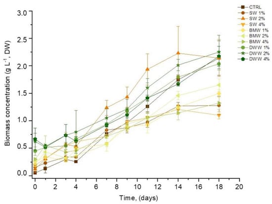 Time evolution of growth curves in terms of dry weight (g L−1) in SW, BMW, and DWW media containing different percentages of CW.