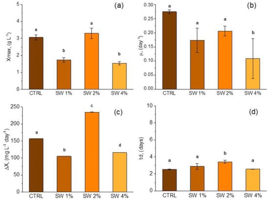 Comparison of growth performance indicators for maximum biomass concentration (Xmax) (a), specific growth rate (µ) (b), average biomass productivity (ΔX) (c), and doubling time (td) (d) in SW media with different CW percentages. Mean differences were compared using ordinary one-way ANOVA followed by Tukey’s multiple comparisons test. For each trait, single-degree-of-freedom contrasts were applied to compare mean values (n = 3 ± SD) between control group and treatment groups, as well as among treatment groups. Means denoted by same letter are not significantly different at p ≤ 0.05, whereas different letters indicate significant differences at confidence level of at least 95% according to Tukey’s multiple comparisons test.