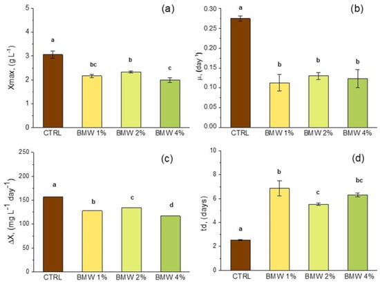 Comparison of growth performance indicators for maximum biomass concentration (Xmax) (a), specific growth rate (µ) (b), average biomass productivity (ΔX) (c), and doubling time (td) (d) in BMW media with different CW percentages. Mean differences were compared using ordinary one-way ANOVA followed by Tukey’s multiple comparisons test. For each trait, single-degree-of-freedom contrasts were applied to compare mean values (n = 3 ± SD) between control group and treatment groups, as well as among treatment groups. Means denoted by same letter are not significantly different at p ≤ 0.05, whereas different letters indicate significant differences at confidence level of at least 95% according to Tukey’s multiple comparisons test.
