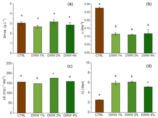 Comparison of growth performance indicators for maximum biomass concentration (Xmax) (a), specific growth rate (µ) (b), average biomass productivity (ΔX) (c), and doubling time (td) (d) in DWW media with different CW percentages. Mean differences were compared using ordinary one-way ANOVA followed by Tukey’s multiple comparisons test. For each trait, single-degree-of-freedom contrasts were applied to compare mean values (n = 3 ± SD) between control group and treatment groups, as well as among treatment groups. Means denoted by same letter are not significantly different at p ≤ 0.05, whereas different letters indicate significant differences at confidence level of at least 95% according to Tukey’s multiple comparisons test.