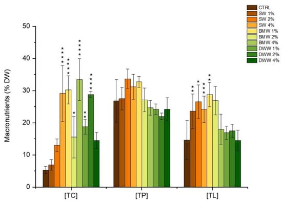 Total carbohydrates (TC), total lipids (TL), and total proteins (TP) obtained in SW, BMW, and DWW media under three different CW contents. Mean differences were compared using Tukey’s test (n = 3; * p indicates < 0.1; ** p indicates < 0.01; *** p indicates < 0.001; **** indicates p < 0.0001).