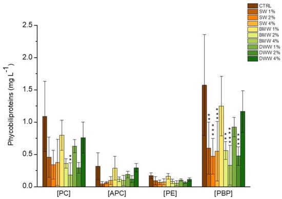 In the current study, PC purity under mixotrophic conditions was found to have an EP ranging from 0.2 to 0.4 with SW, from 0.2 to 0.45 with BMW, and from 0.45 to 0.70 with DWW, compared to 0.55 in the control (Figure 7a). The highest level of purity (0.70) was reported by DWW-4%. Correspondingly, the PC yields ranged from 20 to 24 mg g−1 for SW, from 18 to 50 mg g−1 for BMW, and from 20 to 48 mg g−1 for DWW cultures compared to 49 mg g−1 in the control (Figure 7b). The highest yields, 50 mg g−1 and 48 mg g−1, were exhibited by BMW-1% and DWW-4%, respectively. These findings are in part consistent with recent research carried out by Russo et al. [39] and by Cavallini et al. [23], which demonstrate that an organic source such as dairy WW in low concentrations (0.5–2% v v−1) can enhance PC synthesis in mixotrophic cultures of L. platensis.