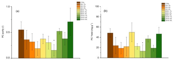 Purity (a) and yield (b) of phycocyanin (PC) in extracts of L. platensis grown in SW, BMW, and DWW media under three different CW contents. Mean differences were compared using Tukey’s test (n = 3, * p < 0.05).