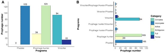 Identification of prophages in Clavibacter genomes using different software. (A) Raw identification of prophages and (B) identified prophages after manual curation.