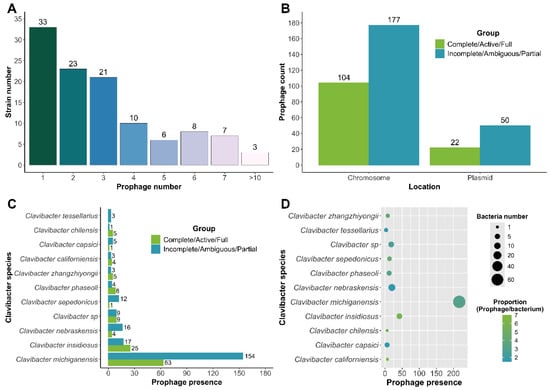 General features of prophage genomes detected in Clavibacter strains. (A) Frequency of prophages detected in each Clavibacter strain; (B) distribution of prophages according to the location in the Clavibacter genomes; (C) presence of prophages in different Clavibacter species; and (D) proportion between the number of strains and the number of prophages present per species.