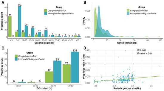 Genomic characteristics of Clavibacter prophages. (A) Distribution of prophage according to genome size (Kbp). (B) Density of genome length distribution. (C) G+C content (%) of Clavibacter. (D) Correlation between bacterial genome size and prophage genome size.