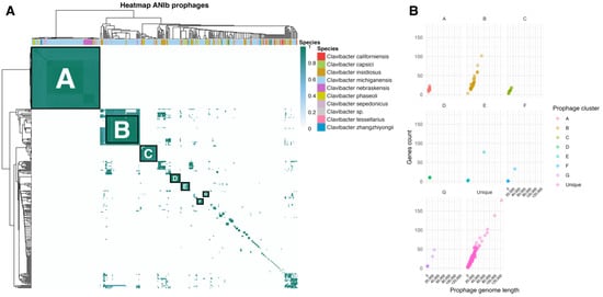 To analyze the genetic diversity of prophages, we created an ANI similarity matrix and constructed a heatmap. This analysis revealed that most of the prophages were grouped into seven clusters, which shared at least of 90% identity, except for groups B and C, where some pairwise comparisons gave ANI values of at least 80% but were clustered together. The remaining prophage genomes showed identity with a few genomes or remained as single prophages, suggesting they were unique. These results indicated high genetic diversity and revealed novel Clavibacter prophages with unique genomes. Additionally, we analyzed the prophages’ genome length and gene content within each cluster (Figure 4B), revealing that clusters with consistent genome sizes and gene numbers, such as A, C, and D, may represent domesticated prophages, while clusters with broader variability, such as B, E, F, and G, may reflect prophages at different stages of degradation. Moreover, the analysis of unique prophages revealed a wide range of gene content and genome size. These results indicated both high genetic diversity and varying evolutionary stages among Clavibacter prophages, uncovering novel prophages with unique genomic characteristics.