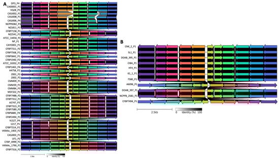 Genome alignments of clusters of Clavibacter prophages. (A) Analysis of prophages from C. michiganensis from cluster A. (B) Analysis of C. michiganensis prophages from group D. Shared genes across genomes are shown by arrows of the same color. The grey horizontal bar shows the degree of gene similarity between the prophage genomes.