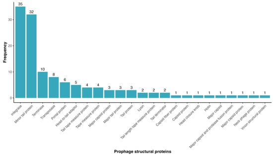 Based on COG analysis, we found only sixteen integrases (L group), six structural proteins (S group), and five terminases (S group). Combined annotation with RAST, BLASTx (limited to virus-related tax ids), and PFAM allowed for the identification of a total of 109 genes encoding phage-related proteins, such as integrases, major and minor capsid proteins, neck, head closure proteins, fibers, tail proteins, and head-to-tail adaptor proteins (Figure 7), which are associated with prophage integration, DNA translocation, and virion structure [67,68,69]. Despite their identification, phage-related proteins are few in comparison with all of the CDSs for predicted prophages, thus it is possible that they could be lost under the domestication events.
