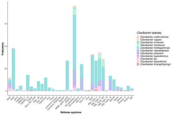 Diversity of defense systems harbored by Clavibacter strains. Most of the defense systems were enriched in C. michiganensis due to more genomes of this species being analyzed in comparison with the others.